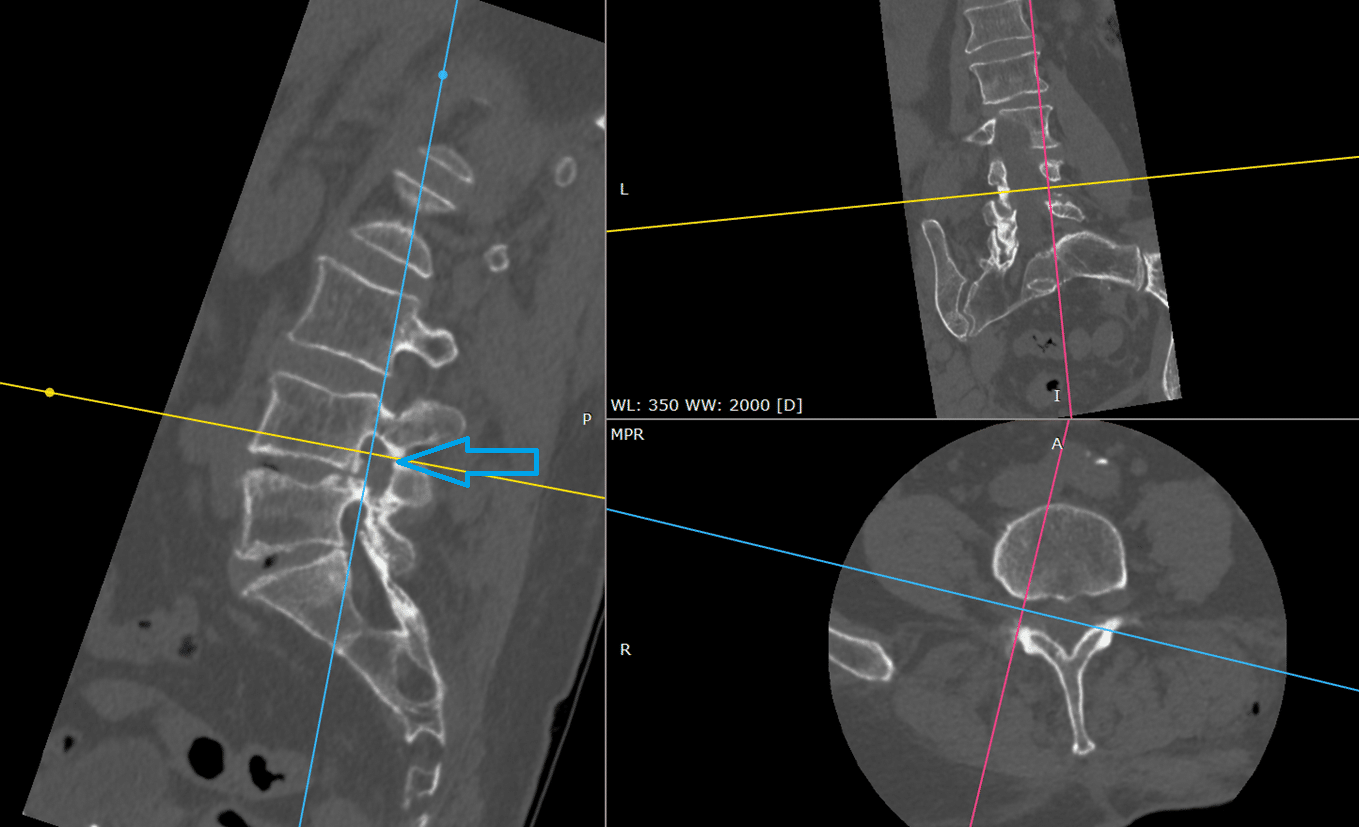 Strzałki wskazują zwężenie kanału korzeniowego po stronie prawej. Pomimo wielomiejscowych zmian zwyrodnieniowych, wystarczające jest leczenie endoskopowe eliminujące ucisk korzenia L4.