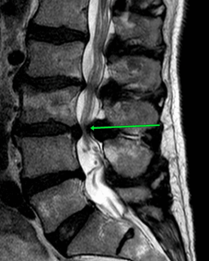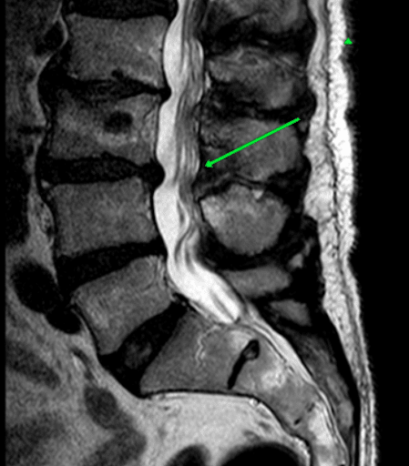 Strzałka wskazuje przerośnięte więzadło żółte, które zwęża kanał kręgowy pomiędzy kręgami L3 i L4.