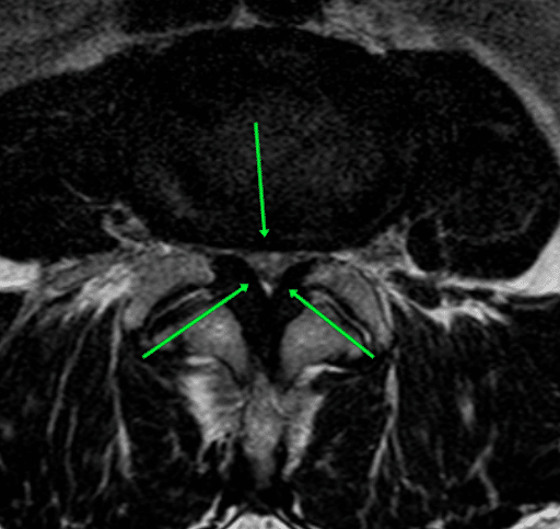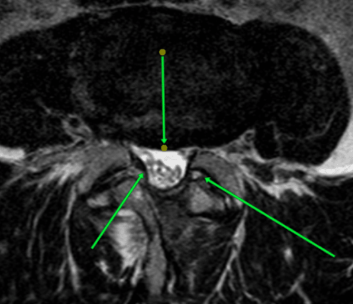 Brak widocznej przestrzeni (średnicy) kanału kręgowego. Strzałki wskazują przerost więzadła żółtego oraz uwypuklenie krążka międzykręgowego, które powodują zwężenie kanału. Zwężenie takie powoduje istotny ucisk na korzenie nerwów i ból.